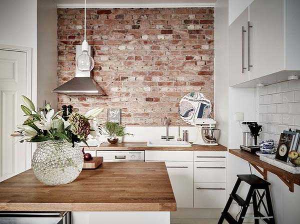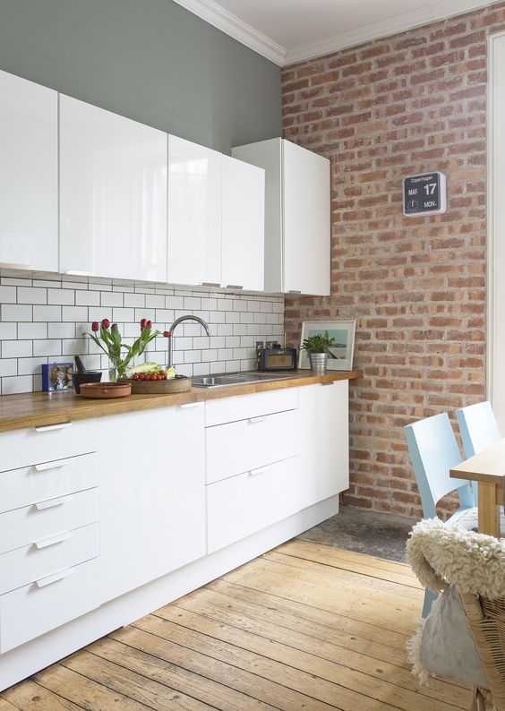 Характерное решение – кирпичная белая стена. Можно отделать так только одну или все стены. Также будет уместен фартук из кирпича либо отделанный под него. В данном случае кирпичной лучше сделать примыкающую к фартуку стену, а не противоположную. Наряду с белым можно использовать и классический красный кирпич.