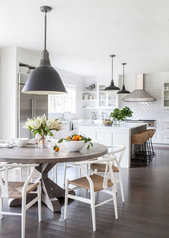 - В обеденной зоне используйте стол из массива, барные стулья с металлическими ножками, кожаные кресла и табуретки из пластика.
