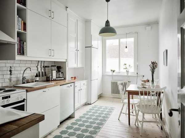 Белая палитра великолепно подходит для оформления небольших помещений, хотя и в просторных домах она является не менее выгодным решением. Стоит принять во внимание, что белый цвет имеет разнообразные оттенки, использование которых поможет добиться более естественного оформления. Это могут быть белые фасады гарнитура или обеденная группа, выбеленная кирпичная кладка со слегка сероватыми «состаривающими» оттенками, потолочная штукатурка и даже окрашенный деревянный пол, делающий помещение значительно шире.