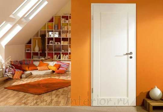 - Стены необязательно должны быть светлых и пастельных оттенков. Дверные полотна белого цвета отлично смотрятся в интерьере, где использована сложная окраска или яркие цвета.