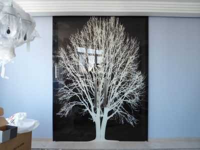 Важно! На светлом фоне затемненное стекло с рисунком контрастно выделяется, отвлекая внимание от окружающей обстановки. Поэтому такие элементы должны иметь поддержку в других предметах обстановки, которые будут уравновешивать яркий декор.