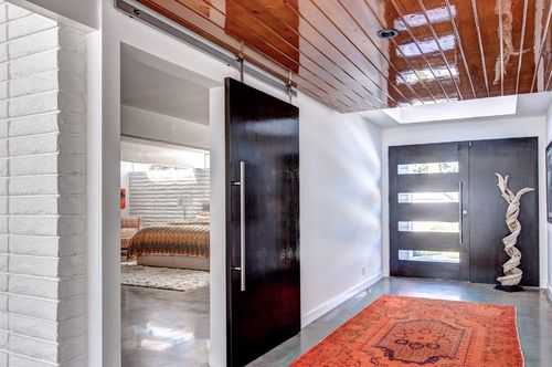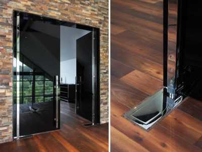 Интерьер с маятниковой конструкцией- Автоматическая дверь с раздвижным механизмом. Обычно такой тип дверного конструкция устанавливается в зданиях общественного назначения. В тот момент, когда человек попадает в зону действия датчика, полотно автоматически открывается;