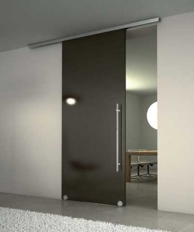 Откатная конструкция темного оттенкаПошаговая инструкция по установке межкомнатной двери с темным стеклом