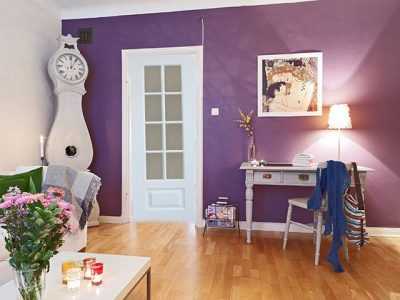 Фиолетовый интерьер не будет угнетающим только с белоснежными дверями- Фиолетовые стены. Такое сочетание создаст величественную и роскошную обстановку. Фиолетовый – это насыщенный и тяжелый цвет, который в чистом виде способен быстро истощить нервную систему и привести к угнетенному состоянию.