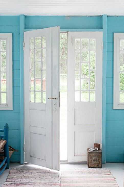 Лучшего способа борьбы с депрессией, нежели синие стены в сочетании с белыми дверями не придумать, а вот союз ярко-жёлтого и белого — идеальный вариант для активизации умственной деятельности, голубой и белый — умиротворит и расслабит, а также поспособствует понижению давления.