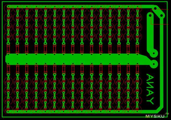 Искал готовую печатную плату простенького светодиодного светильника, так как перспектива пайки девочкой 10-ти лет на макетке не внушала уверенности в получении необходимого результата. В общем, не найдя ничего подходящего, нарисовал плату в программе Sprint Layout из расчета размера заготовки 7 на 10 см — чтобы ничего не вырезать. Основным критерием было легкость пайки ребенком и возможность остановится в пайке получив нужную яркость (не обязательно паять все элементы). Также хотелось сделать так, чтобы почти в любой момент можно было проверить и поправить полученный результат. Вышло примерно так:
