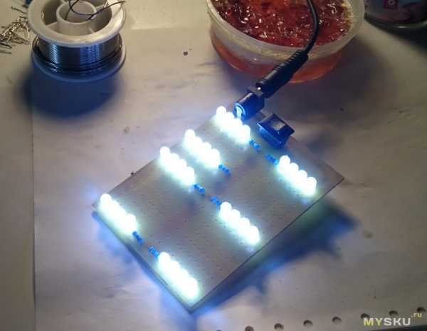 Паяльник с жалом Т12, флюс ЛТИ120. Промежуточное тестирование каждый раз вызывало волну эмоций — разных: если где то закоротили и не светит активно искали проблему, если все светилось — было «Вау».