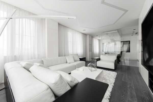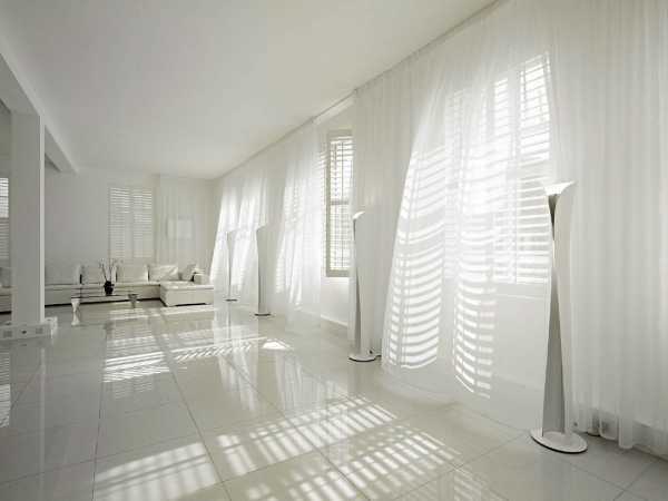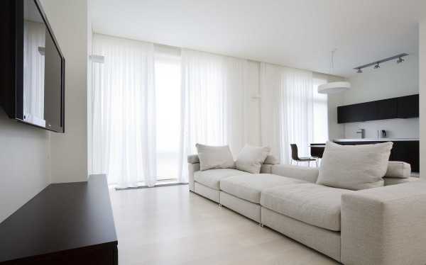 Самый привычный и распространенный вид белых штор в интерьере квартиры ― тюль, вуаль или органзаСветлые цвета незаменимы, когда нужно зрительно увеличить объемы пространства, добавить в него света и воздуха. Поэтому белые портьеры и обои всегда были востребованы в небольших помещениях с окнами, выходящими на северную сторону. Но в последнее время в кипенные, молочные и облачные тона стало модно оформлять даже просторные квартиры студии. Причем часто светлыми в них делают не только стены и потолки, но и полы. Как уже говорилось выше, такая комната ничуть не напоминает больничную палату, а выглядит дорого и элегантно.