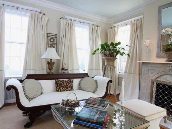 Кроме всего прочего, использование белых штор – идеально для малогабаритных гостиных комнат, да еще и таких, которые мало освещаются. Ведь светлые тона способны зрительно расширять помещение! Здесь рекомендуется оформлять окна дорогостоящими, блестящими тканями. Например, торжественности поможет придать атлас, который дорого и торжественно выглядит.