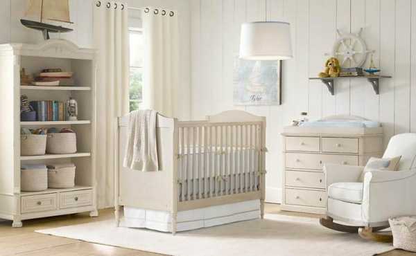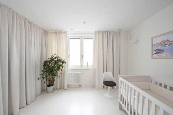 Белые однотонные шторы и стены с небольшой примесью розового или голубого ― прекрасное решение в комнату новорожденного