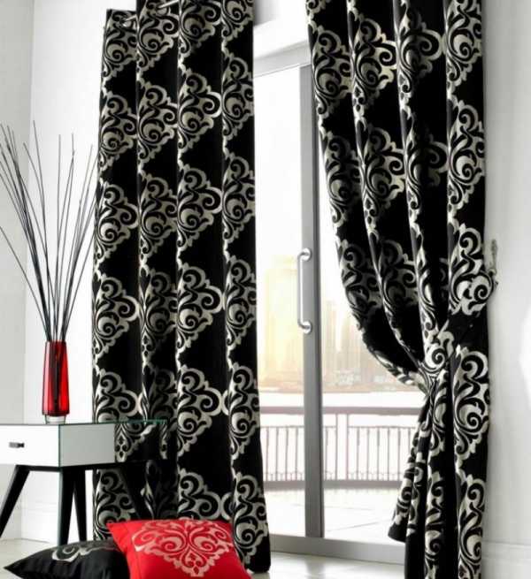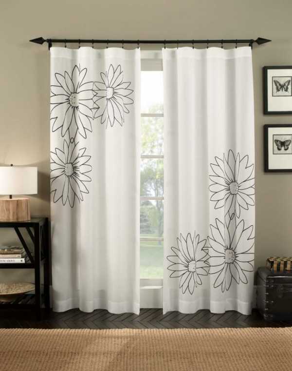 Комната так – же будет выглядеть изысканно и грамотно если повесить белые шторы с черным узором. То не плохой и вполне удачный вариант для гостиной комнаты.