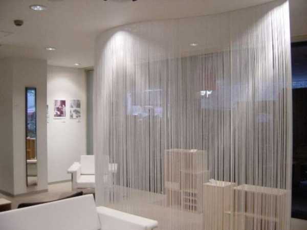 Белый цвет используют также для того, чтобы зонировать пространство. От него не будет ощущения, что в комнате какие-то преграды, но и четкость линий будет визуализироваться. Чтобы зонировать кухню-студию, следует выбирать занавески с бусинами, нитями. Такие варианты штор, кстати, просто изумительны для девичьей деткой. Для гостиных же комнат прекрасно подойдут японские панели.