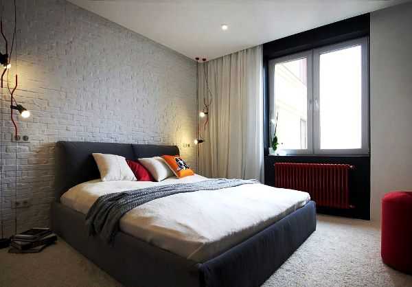 Нередко кирпичная кладка разделяет пространство на зону для сна и гардеробную, поэтому комбинировать такой материал с другой отделкой нужно с умом.