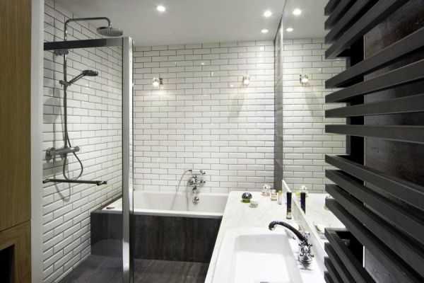Правильный дизайн ванной комнатыПрекрасный вариант отделки стен в ванной при помощи кирпича можно увидеть на следующем фото. Здесь видно прекрасное сочетание различных материалов в виде темного дерева, стали и плитки.