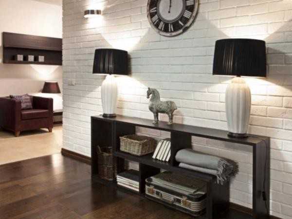- Холл или коридор. Кирпичная отделка незаменима в комнатах с высокой проходимостью. С крашеной кладки легко удалить следы любых загрязнений. Кроме того, белая фактурная поверхность визуально увеличит помещение.