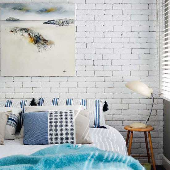 Дизайн спальниДизайнеры советуют применять белый кирпич в спальне возле кровати или напротив нее.