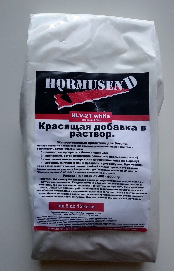 Даже белый цемент не всегда дает требуемую чистоту цвета, а использование инертных заполнителей (щебня, крошки, отсева, карьерного песка) темных тонов — сильно усугубляет ситуацию. В таких случаях используют диоксид (двуокись) титана. Титановые белила добавляются в состав бетона в количестве 1-3% по массе ВСЕЙ смеси ( в отличие от других красителей добавляемых в % по массе вяжущего).