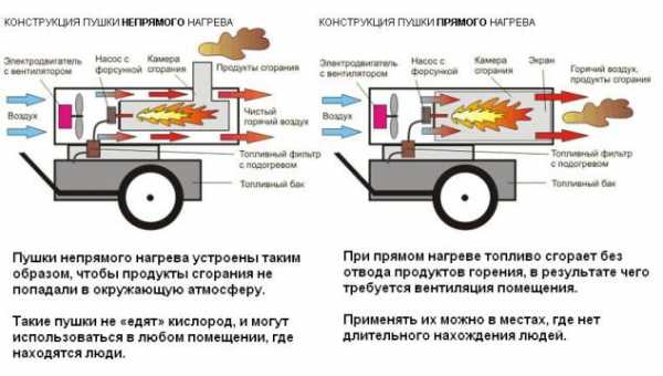 - дизельные пушки прямого нагрева, в котором нагретый воздух выводится напрямую в помещение