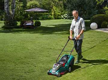 - Регулируют нажатием соответствующего рычага высоту каждого колеса по отдельности (как в Bosch Rotak 40 и др.).