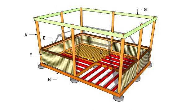 Когда беседка уже приняла свои очертания, можно начинать укладывать пол. Для этого необходимо к нижней обвязке прикрепить лаги — деревянные бруски, на которые сверху будут укладываться доски.