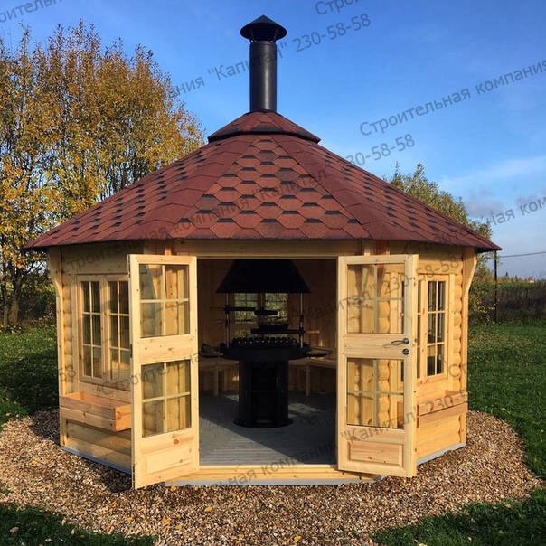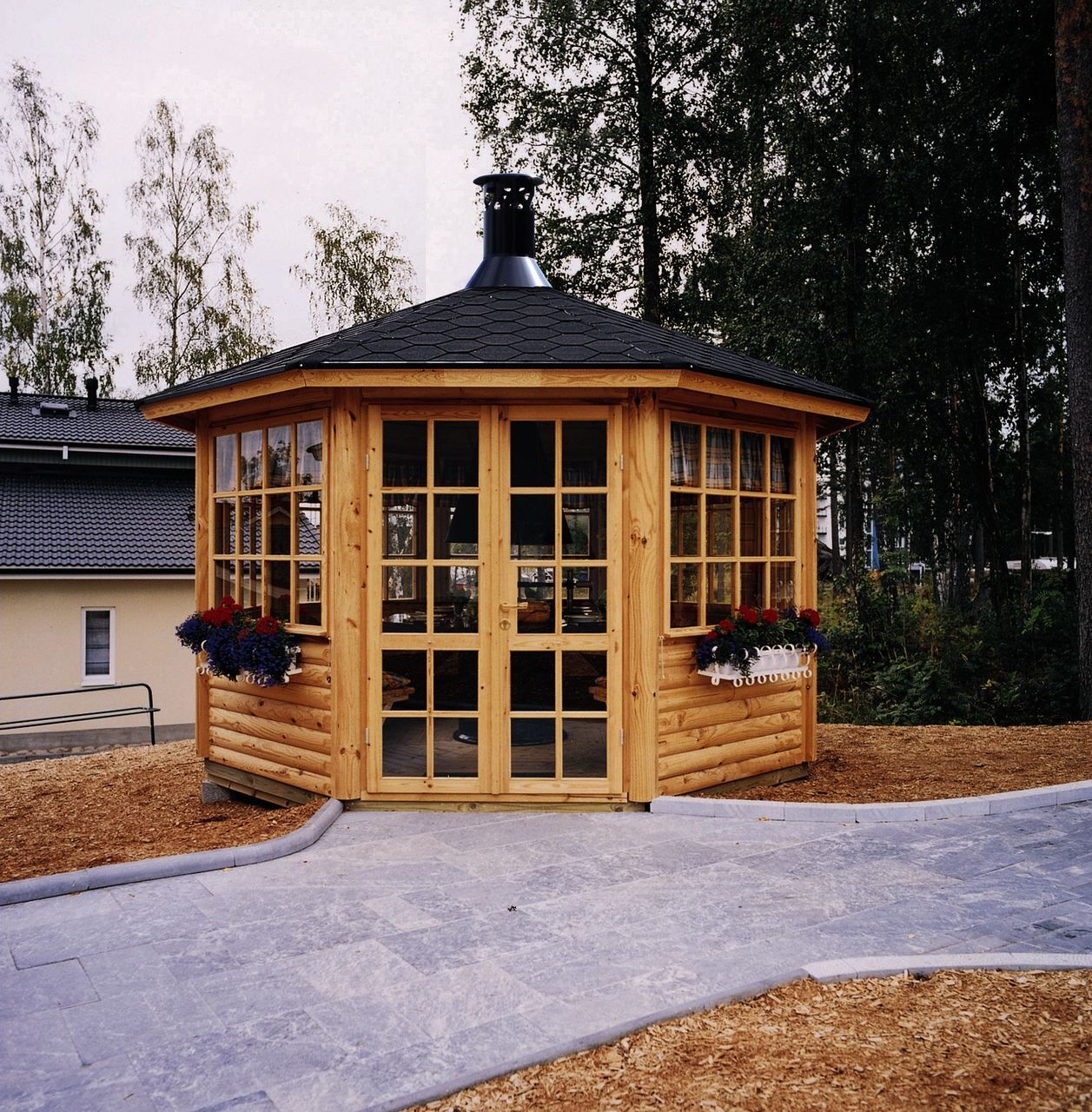 - Небольшая финская беседка с грилем в центре имеет много посадочных мест и закрывается от непогоды.