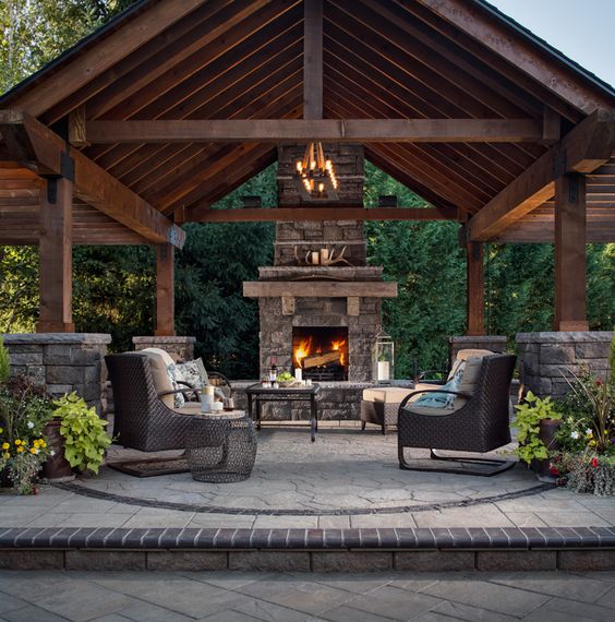 Деревянная беседка в современном стиле, подвесные стульяДеревянные конструкции беседок отлично подходят для занятий спортом на открытом воздухе и мест для медитации. Открытые зоны отдыха под крышей могут быть оборудованы классическим барбекю, печью для пиццы, камином или плитой, что позволит вам и вашим гостям провести время на свежем воздухе в течение длительного времени.Летние кухни — еще один отличный вариант для уличных комнат.