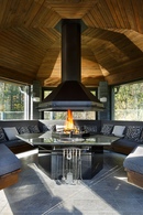 - Большая полуоткрытая зона отдыха выполнена из дерева, стены и потолок пропускают много света.
