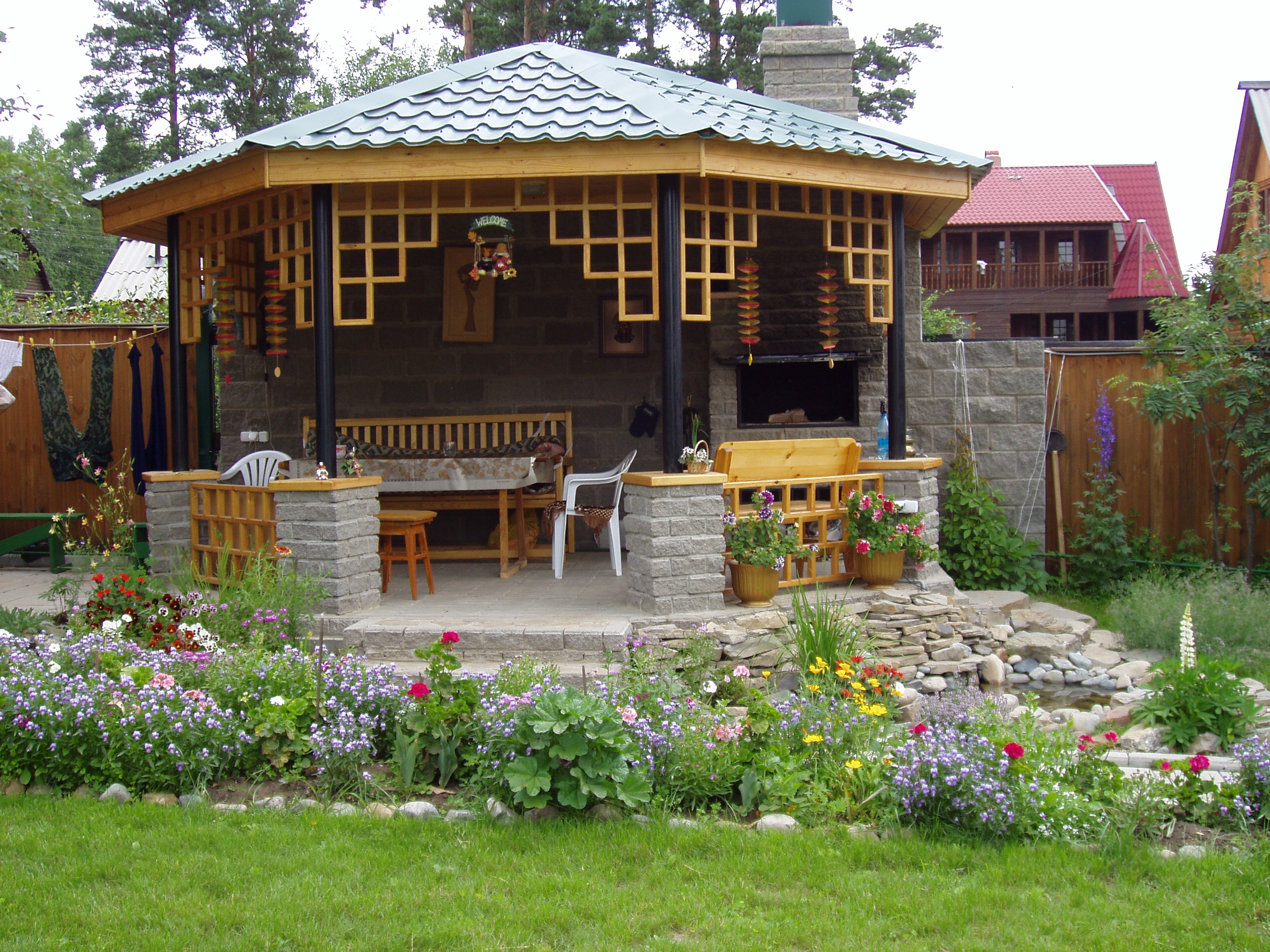 Дачные беседки красивы и многообразны, открытый огонь всегда притягивает и делает их максимально уютными.