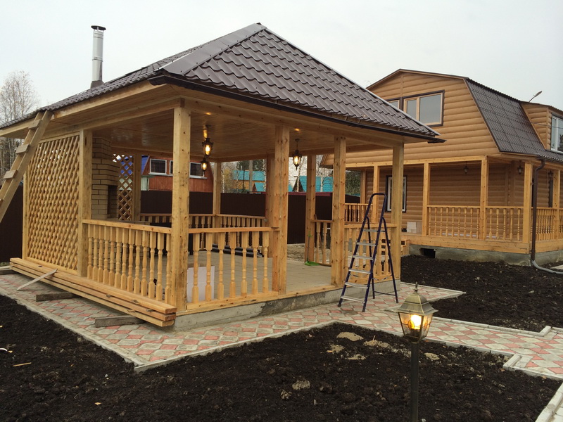 Основным конструкционным материалом оказывается брус либо бревно. Выбор гладкой или скатной кровли — дело сугубо личного вкуса. В некоторых случаях пристроенная беседка оснащается бассейном. Правда, это требует выкладки поверхности пола стойким к попаданию влаги материалом.