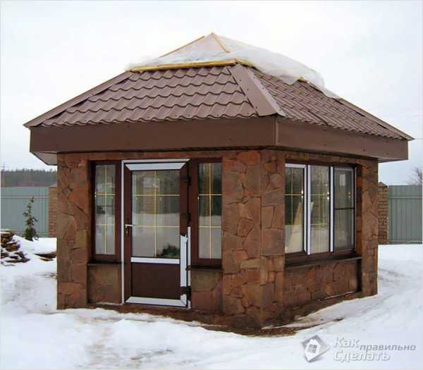В некоторых случаях, чтобы сделать такую зимнюю беседку, стены возводятся из песчаника или дикого камня. Но делают это только тогда, когда этого требует общая концепция дачного оформления, в зависимости от дизайна.