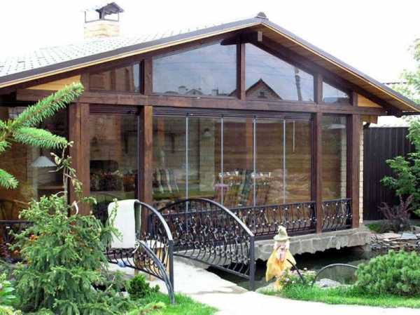 - В закрытой модификации для дачи всегда присутствуют стены, очень часто эту роль играет панорамное остекление, а иногда стены делаются из металла ажурной ковки.