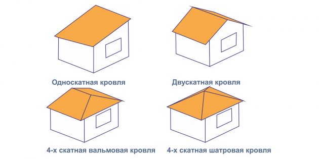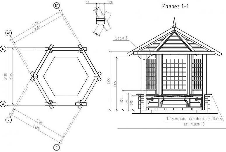 Вот смотрите, внизу мы видим разные беседки — с плоской крышей, и с двухскатной крышей, и четырехскатной крышей, и беседку в форме шестиугольника.