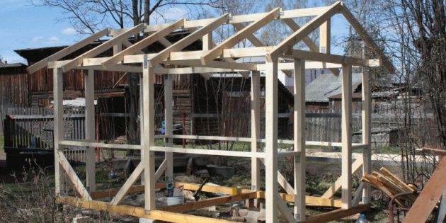 Чтобы верхний брус не прогибался под тяжестью самого себя, или если вы планируете тяжелый настил крыши – можно добавить ПОДПОРКИ – УКОСИНЫ. То есть небольшие диагональные отрезы брусов, которые нужно разместить по углам нашего каркаса, как на фото ниже.