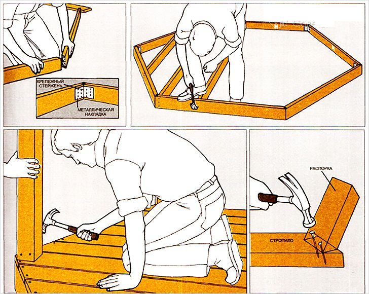 И тогда места крепления опорных столбов беседки должны совпадать с тем местом , где под половой доской лежит тостая черновая балка. Чтобы беседка стояла на прочном основании, а не на пустотелом месте деревянного помоста.