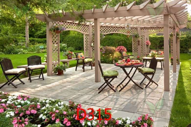 В верхней части между основными стойками крепятся декоративные перекладины в виде арочных решеток. Они придают конструкции дополнительную устойчивость и выступают в роли декоративных элементов. Вход в такую беседку открыт со всех сторон, поскольку ограждения нет совсем.