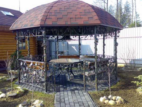 Элегантная беседка, кованая для дачи, бывает разной формы: прямоугольной, многоугольной, квадратной, круглой или овальной.