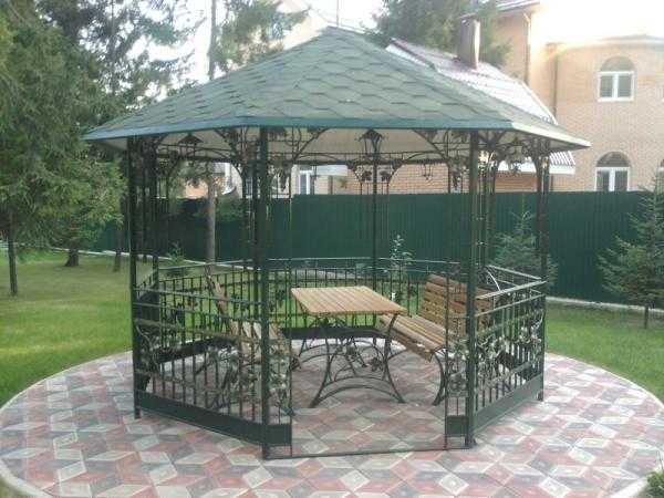 Металлу сильное нагревание, не страшно, но если на беседке дополнительно сделана ажурная конструкция из другого материала, то она может развалиться. Поэтому металлические беседки желательно устанавливать в тени, окружёнными деревьями.