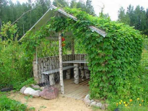 - Для владельцев полностью открытых беседок, будет хорошим решением насадить вьющиеся и кустистые растения (дикий виноград, ипомея, лимонник, актинидия). Со временем растение может оплести ваше сооружение и создаст живую изгородь.