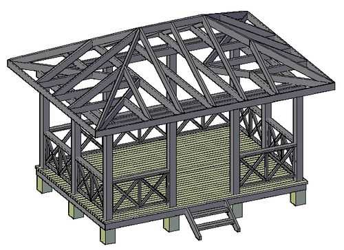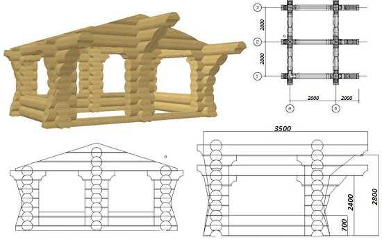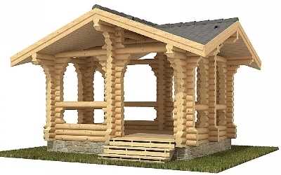 Увеличивается и перечень материалов, которые могут использоваться при строительстве. Например, вы можете спроектировать открытую или закрытую беседку из бревна, как на рисунке внизу. Но не забываем, что с увеличением площади постройки увеличивается сложность ее проектирования. Особенно внимательно стоит отнестись к расчету стропильной системы и фундамента во время составления проекта.