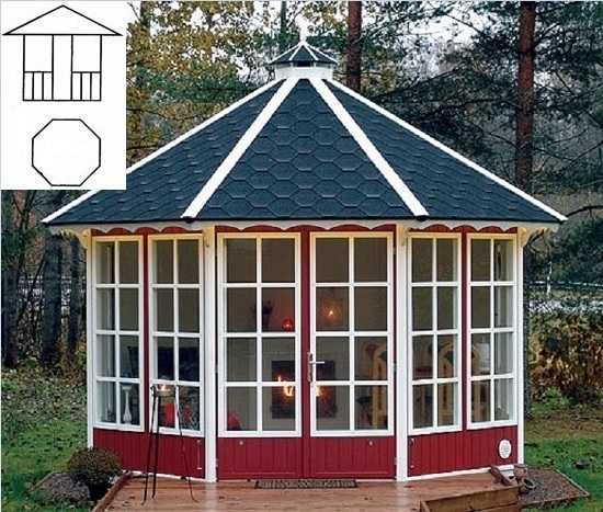 Есть несколько форм, которые часто используются самостоятельными застройщиками при проектировании беседок. Да и специализированные фирмы проектируют на их основе типовые садовые домики. В этом разделе – немного о каждой из этих форм.