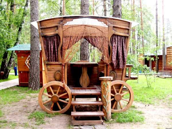 Например, на фото – беседка-карета, она может являться отсылкой к русским сказкам. Но если вы спроектируете беседку-дилижанс, то это будет уже оформление сада в стиле дикого запада. Беседка в виде корабля, соответственно, морская тема. Так же это может быть автомобиль, самолет и многое другое, вид проекта зависит только от вашей фантазии.