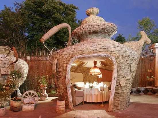 Но не только средства передвижения берутся за основу при проектировании. В качестве прообраза конструкции могут быть использованы самые разные вещи. Интересный пример плетеной беседки вы можете рассмотреть ниже. Также из лозы делаются садовые домики в виде кувшинов, грибов, желудей и т. д. Главное, спроектировать каркас, а повторить его формы плетением труда не составит.
