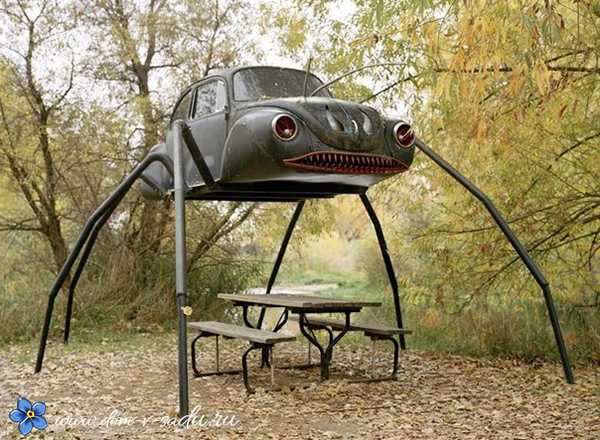 Первым из них стоит упомянуть корпус отработавшего автомобиля. Почему бы не сделать из него крышу будущей зоны отдыха? Возможно, это не подойдет пожилой паре, но станет тем, что надо молодой креативной паре.