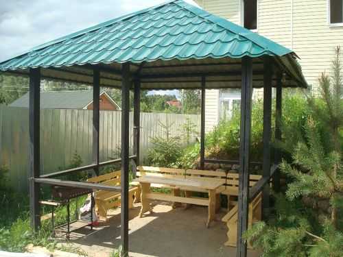 Скрепляются различные элементы беседок при помощи уголков. Трубы различного сечения и профиля под силу собрать воедино практически любому, кто хоть немного умеет пользоваться сварочным аппаратом. Традиционно конструкцию выполняют из труб, сваренных в прямоугольный каркас. Его обычно покрывают металлопрофилем или шифером.