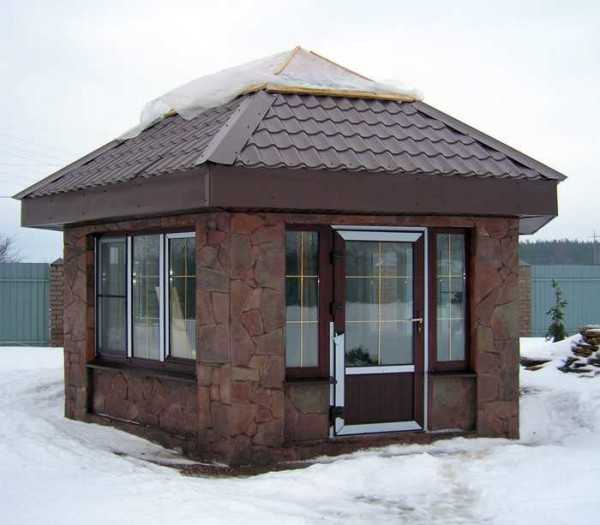 Чтобы использовать беседку круглогодично, понадобится выполнить основательную постройку. Обычно для таких целей сооружают закрытые конструкции. Чтобы в нее не проникал холод, постройку оборудуют плотной дверью. Для осмотра местности используют панорамные окна. Иногда эту беседку можно использовать в качестве гостевого домика.