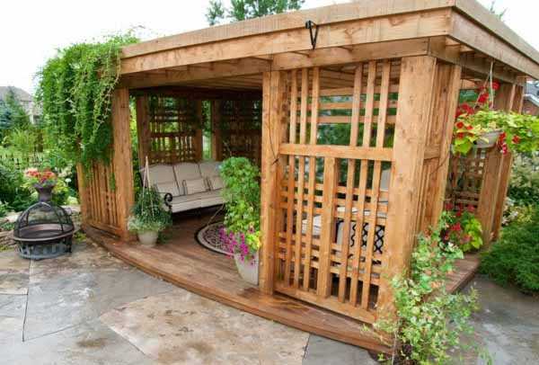 Тем, у кого залежались деревянные поддоны, не нужно долго думать над проблемой простой беседки. Они уже собраны в готовые фрагменты для стен этой постройки.
