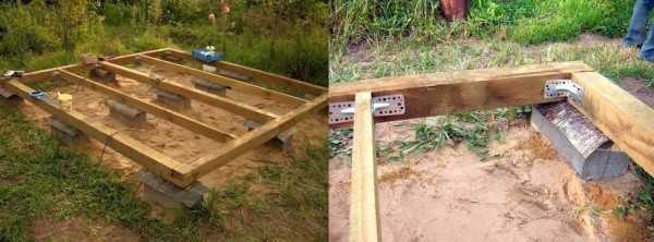 После установки опор, кладем на них нижнюю обвязку. Брус обвязки скрепляется или гвоздями от 150 мм, или же саморезами. Можно еще использовать уголки для надежности связки.