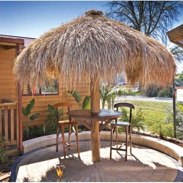 Зонтик можно сделать своими руками — деревянный. Строительных материалов для ее изготовления не нужно очень много. Воспользоваться одним бревном или толстым брусом для опоры. А потом сверху смастерить крышу в виде зонтика.
