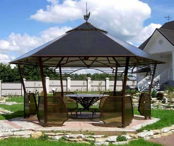 Беседка может быть мобильной или стационарной. Как правило, внешний вид такого сооружения не отличается изысканностью: простейшая конструкция, без архитектурных излишеств. Неоспоримые плюсы этого материала – надежность и долговечность. В основном можно обойтись без фундамента. А вот минусы превалируют.