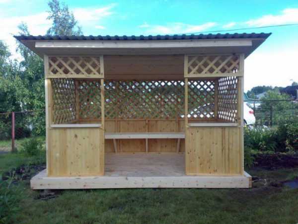 Небольшое сооружение из дешевых строительных материалов (доска, профнастил) комфортными для отдыха размера.